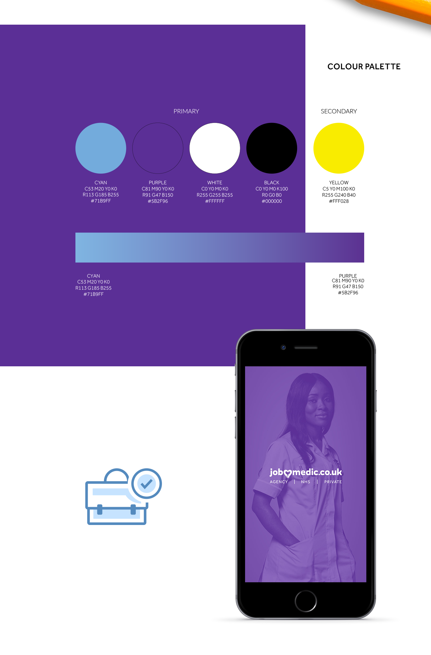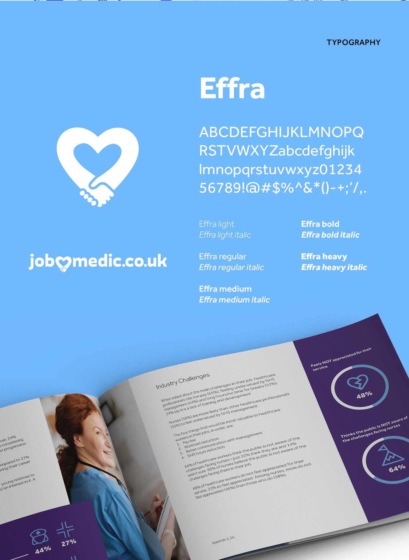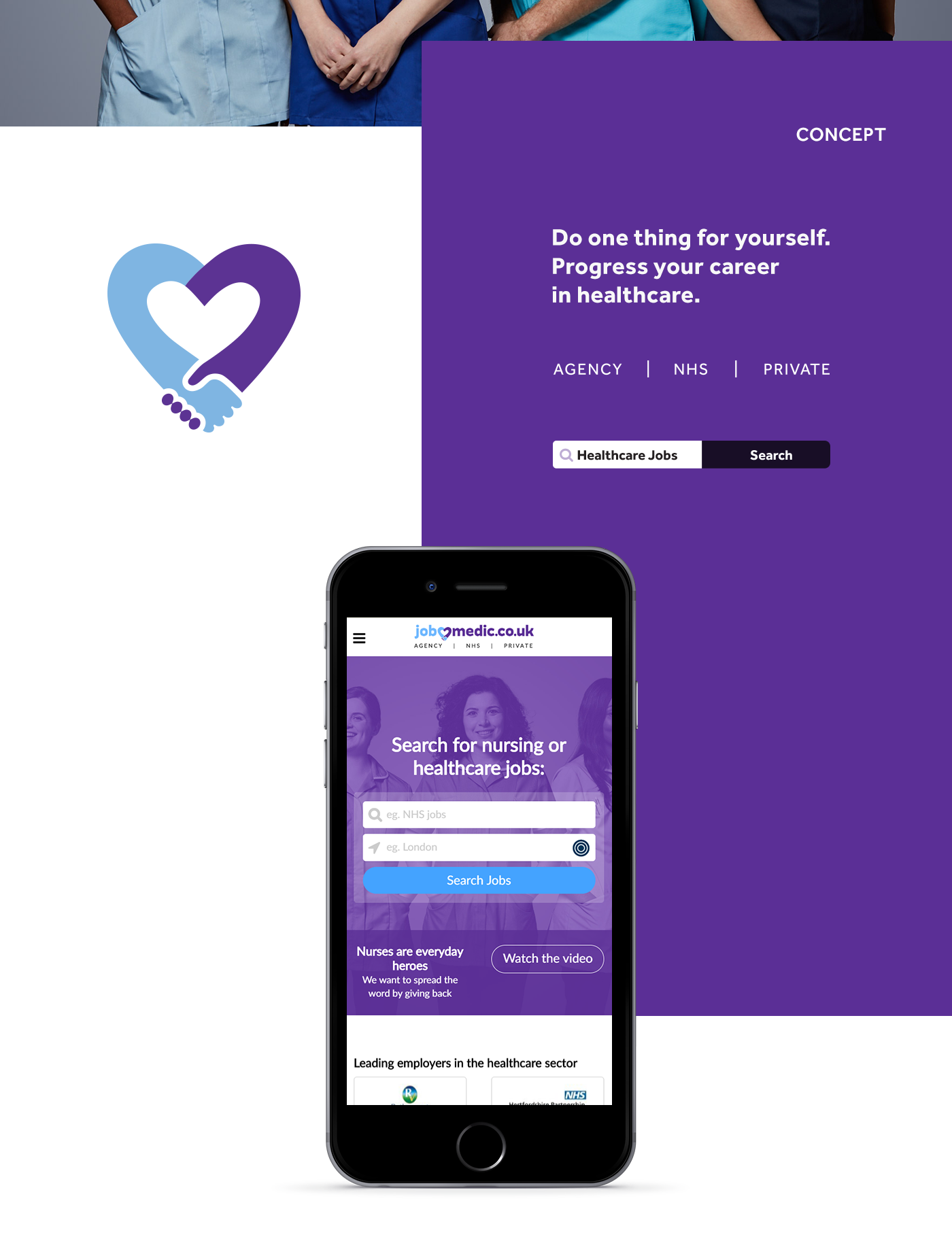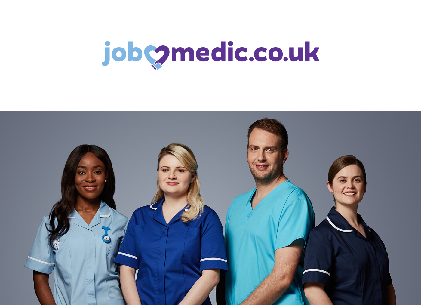 Rebranding of Jobmedic, formerly known as StaffNurse, a healthcare and nursing recruitment advertising site in the UK. The design work included brand discovery and development, concept creation, logo design, UI/UX and print design.